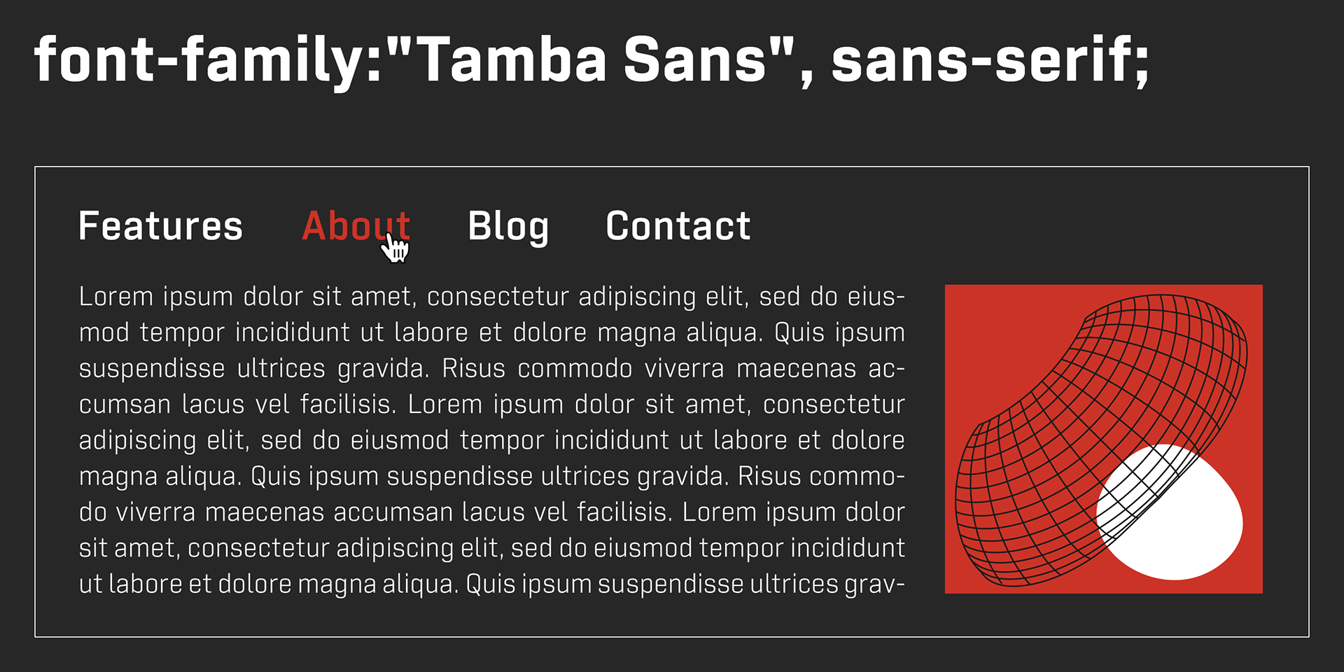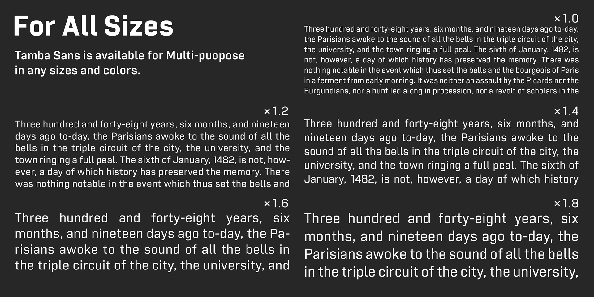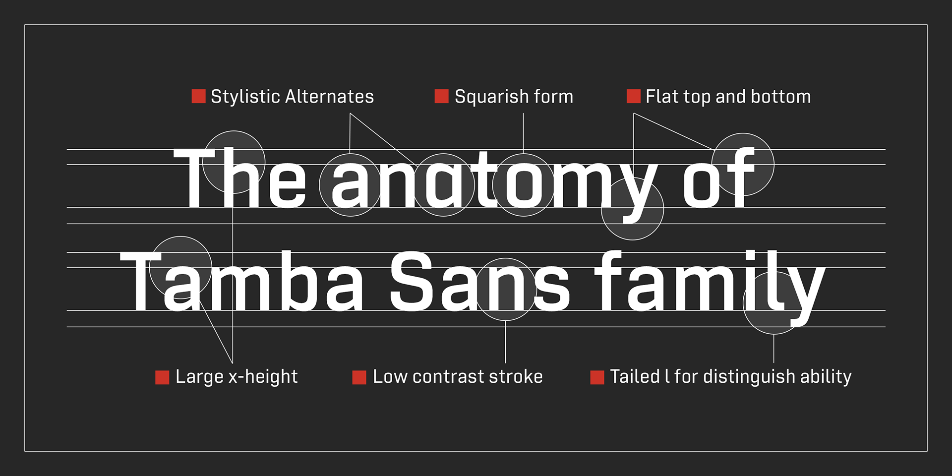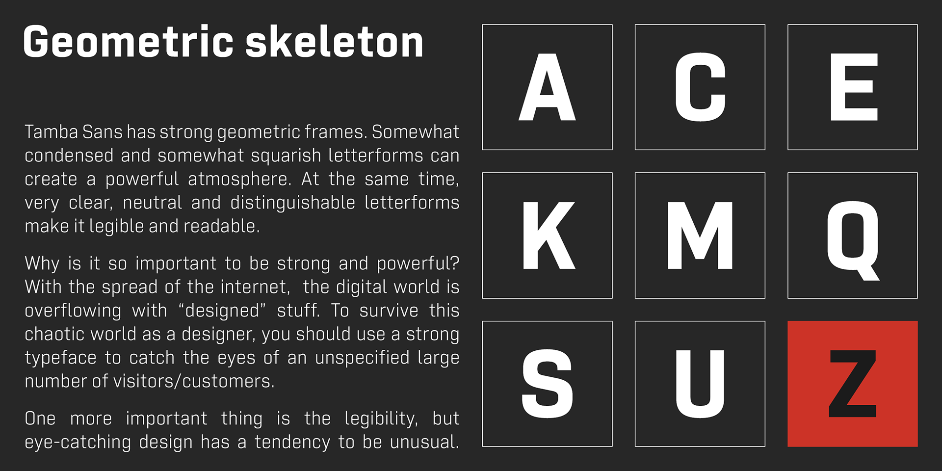 Tamba Sans has strong geometric frames. Somewhat condensed and somewhat squarish letterforms can create a powerful atmosphere. At the same time, the very clear, neutral and distinguishable letterforms make it legible and readable.
