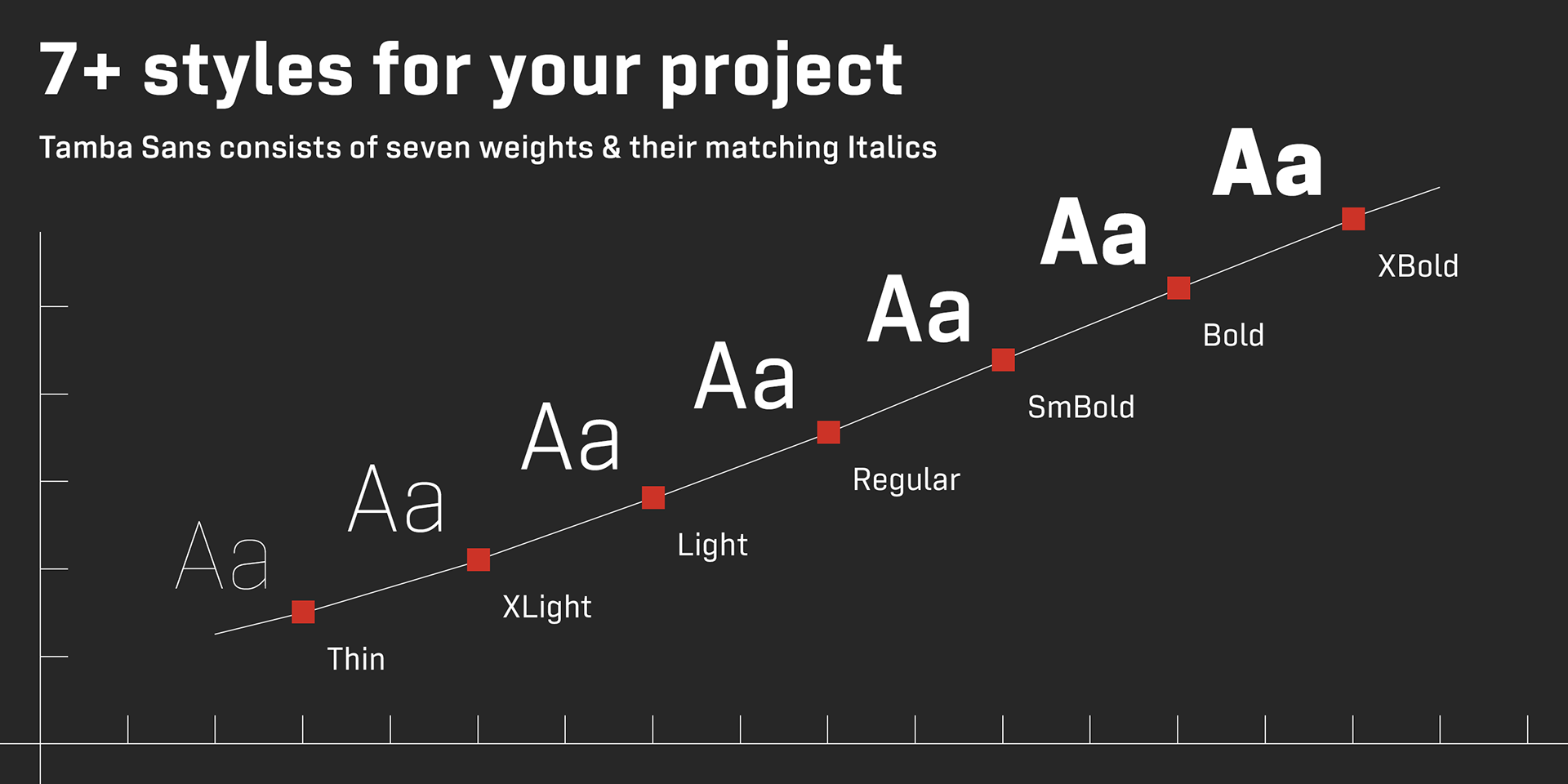 Tamba Sans consists of 7 weights and their matching Italics for a wide range of usages.
