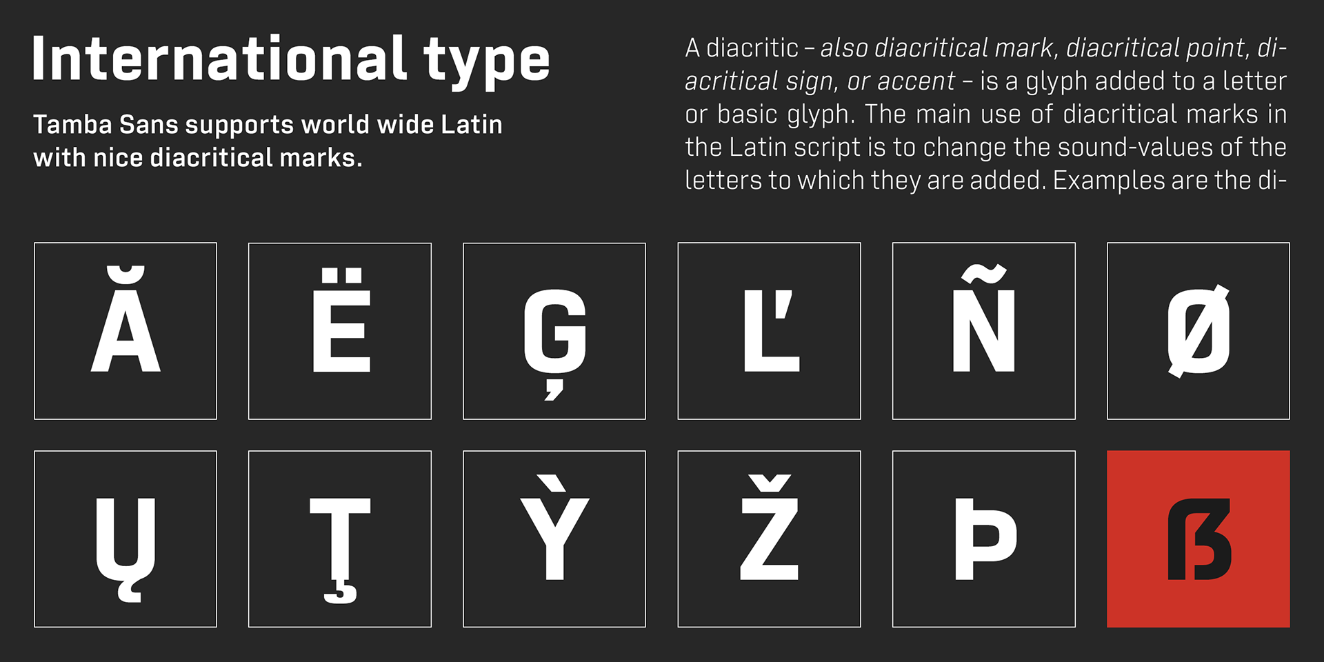 Farther, Tamba Sans is supporting international Latin languages and basic Cyrillic languages including Basic Latin, Western Europe, Central and South-Eastern Europe. Also CSS covers Mac Roman, Windows1252, Adobe1 to 3. This wide range of international characters expands the capability of your works.